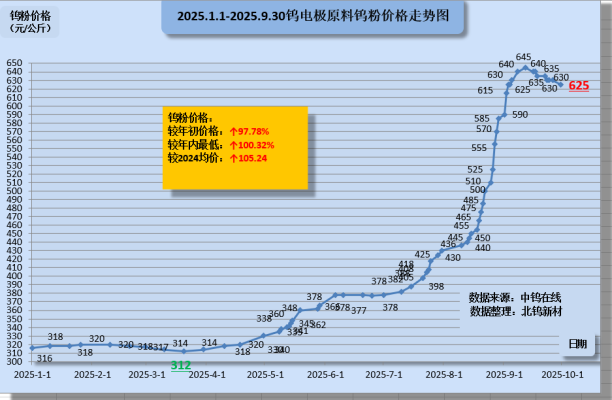 今年以来,钨市场以惊人的涨势迎来了一场“金属风暴”。截至9月底,钨粉价格年度累计涨幅已达近100%,创下历史新高。